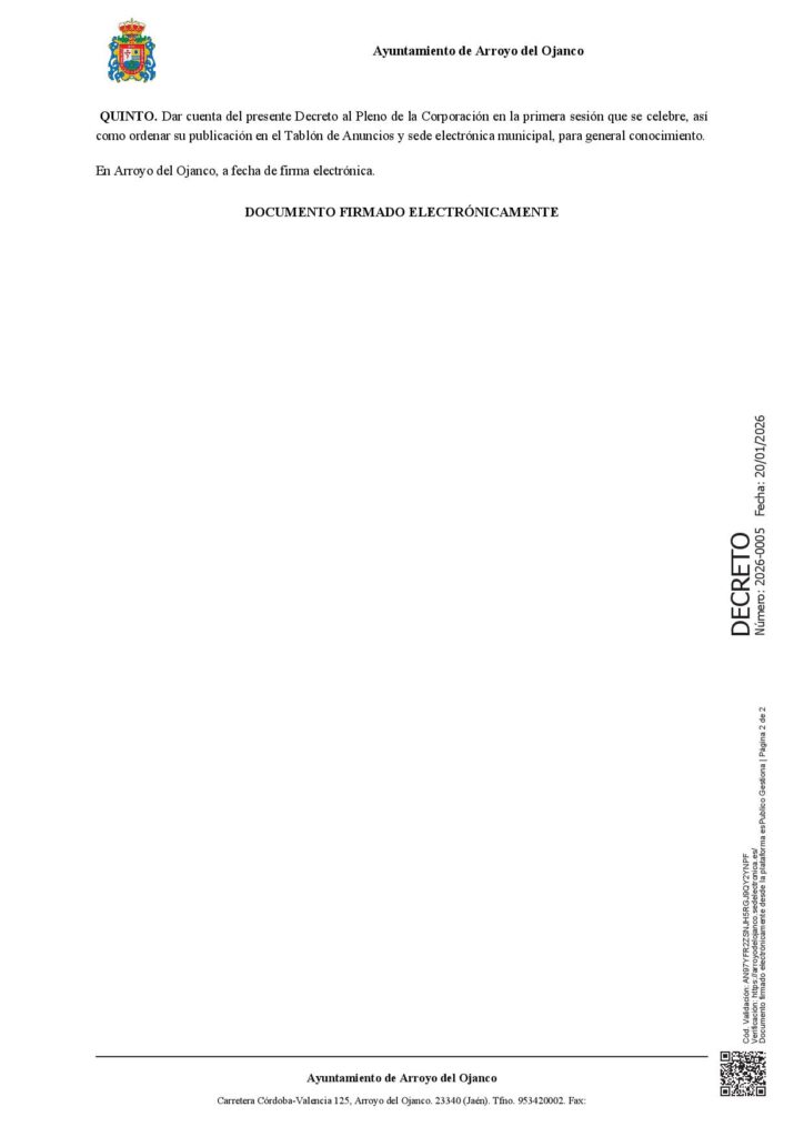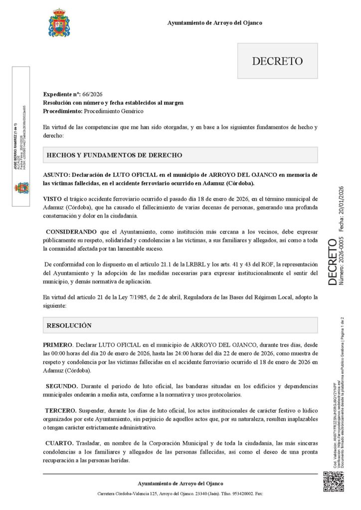 El ayuntamiento de Arroyo del Ojanco ha decretado tres días de luto oficial, desde las 00:00 horas del día 20 de enero de 2026, hasta las 24:00 horas del día 22 de enero de 2026, como muestra de respeto y condolencia por las víctimas fallecidas en el accidente ferroviario ocurrido el 18 de enero de 2026 en Adamuz (Córdoba).
