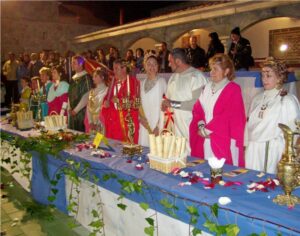 A continuación tuvo lugar la escenificación del ritual de un banquete romano, que era todo un arte y sobre todo… ¡espectacular!. Comenzaba con la cena y una invocación a los dioses, a continuación cada comensal era ubicado en su lugar correspondiente. Entre manjar y manjar la velada iba pasando, hasta el momento en el cual los invitados eran perfumados y coronados. Seguidamente se recitaban poesías, conversaban de temas filosóficos y salían bailarinas danzando al son de la música. Toda clase de comida era dispuesta en las mesas, llegando finalmente a los postres en los que se bebía gran cantidad de vino. Finalizando así la velada.